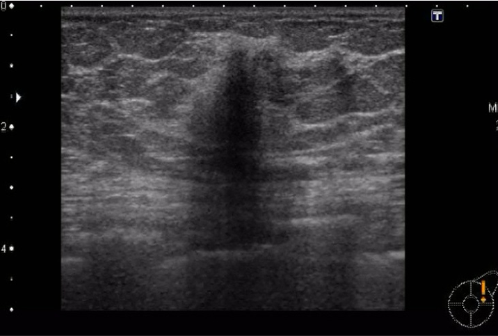 乳房超音波検査を行った。そのときの超音波画像(動画1枚、静止画1枚)を示す。